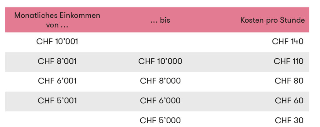 PACH Pflege- und Adoptivkinder Schweiz verrechnet Beratungen einkommensabhängig. Folgende Tabelle dient als Richtlinie für die Vereinbarung des Beratungshonorars: